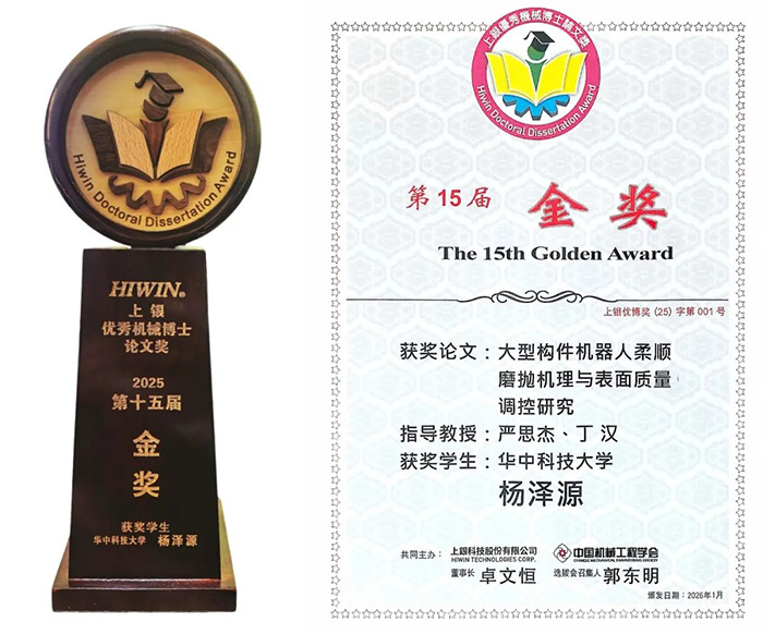 日前,由丁漢院士、嚴(yán)思杰教授指導(dǎo),華中科技大學(xué)與集萃數(shù)字制造裝備與技術(shù)研究所聯(lián)合培養(yǎng)的博士楊澤源,斬獲第15屆“上銀優(yōu)秀機(jī)械博士論文獎(jiǎng)”金獎(jiǎng)。